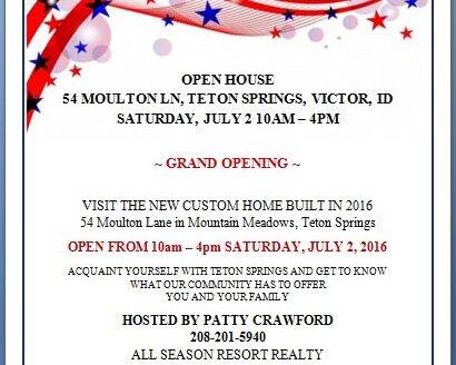 WHAT: OPEN HOUSE WHEN: SATURDAY, JULY 2 from 10am – 4pm WHERE: 54 MOULTON LN, TETON SPRINGS, VICTOR, ID WHO: